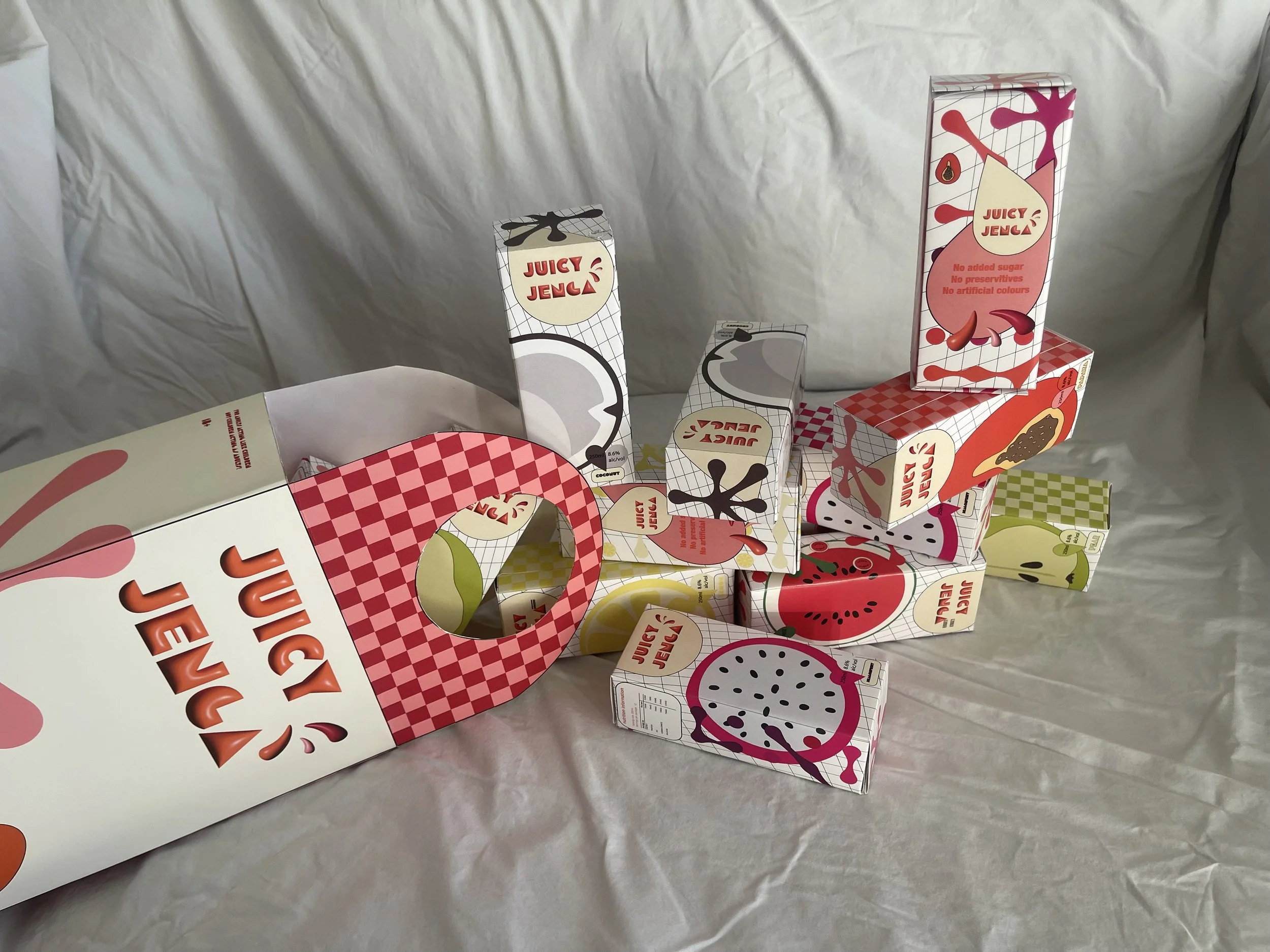 Juicy Jenga is an alcoholic beverage with seven fruity flavours, a branding concept I created as one of my last assignments at RMIT. The drinks are packaged in a juice box form and are intended to be re-used to play a game of Jenga. I have created this concept in hopes to represent the idea that being an adult should never stop you from having fun in a sustainable way.